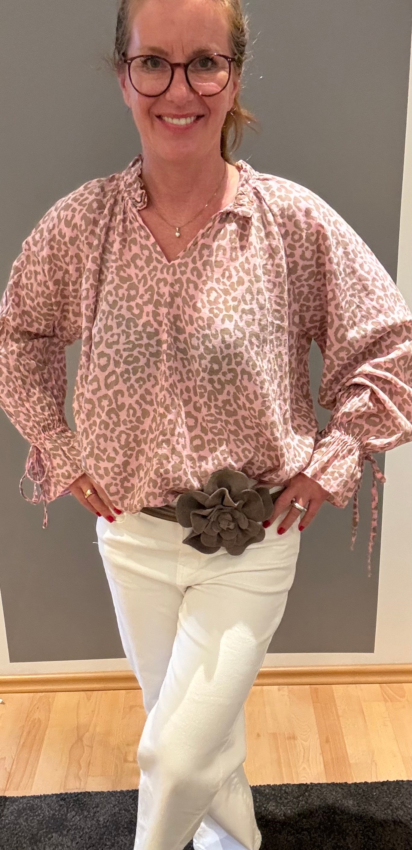 Diese tolle Leo-Bluse in den harmonischen Farben rosa-khaki mit langen Ärmeln und Schleifen ist der perfekte Begleiter für den Sommer.