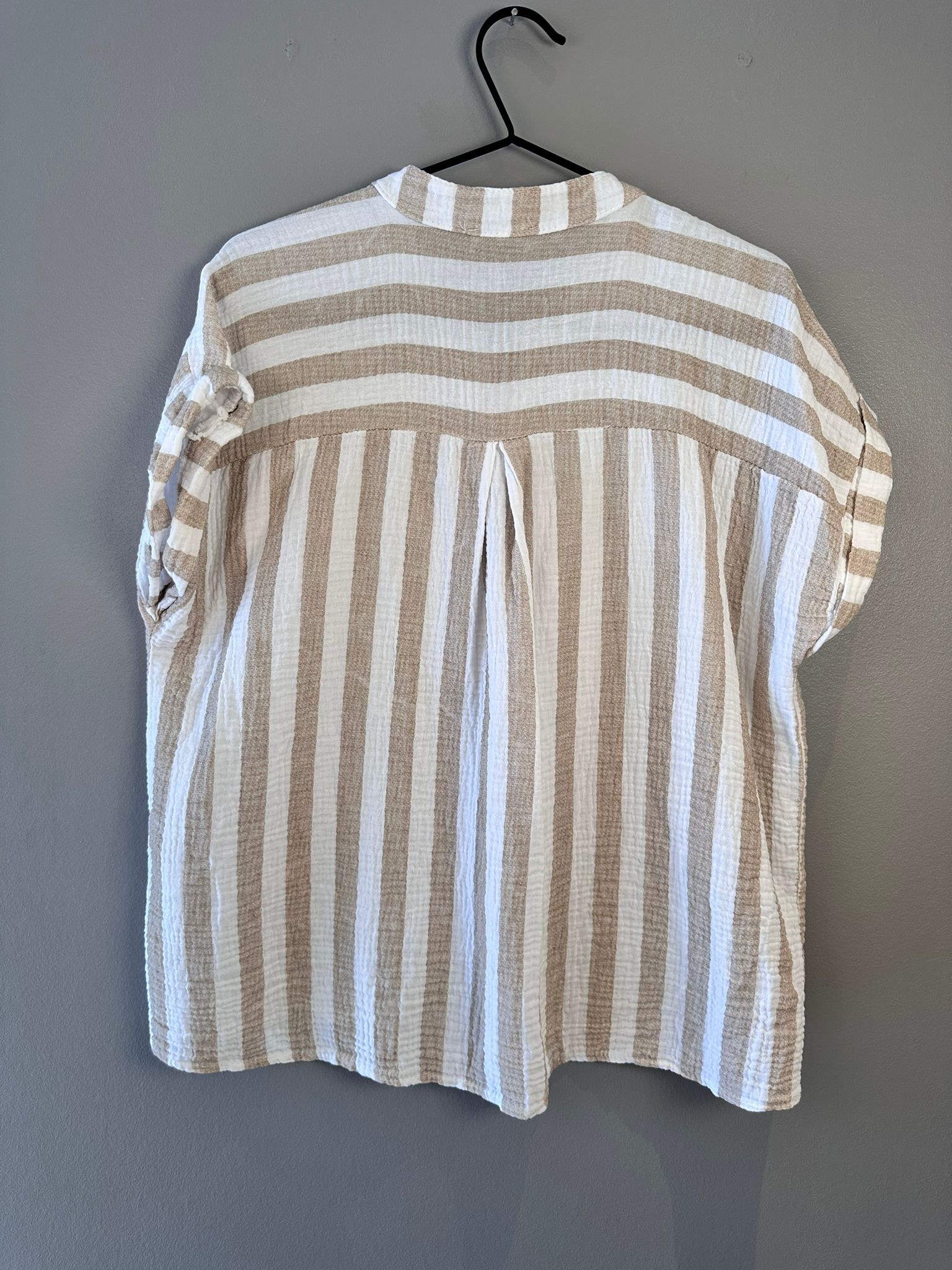 Verleihen Sie Ihrem Sommer-Look mit unserer kurzärmligen, geknöpften Bluse im süßen Streifen-Look eine perfekte Ergänzung. Die Bluse ist perfekt für alle beigefarbenen Sommerhosen und eignet sich auch ideal zur Jeans. Einfach, aber dennoch stilvoll.