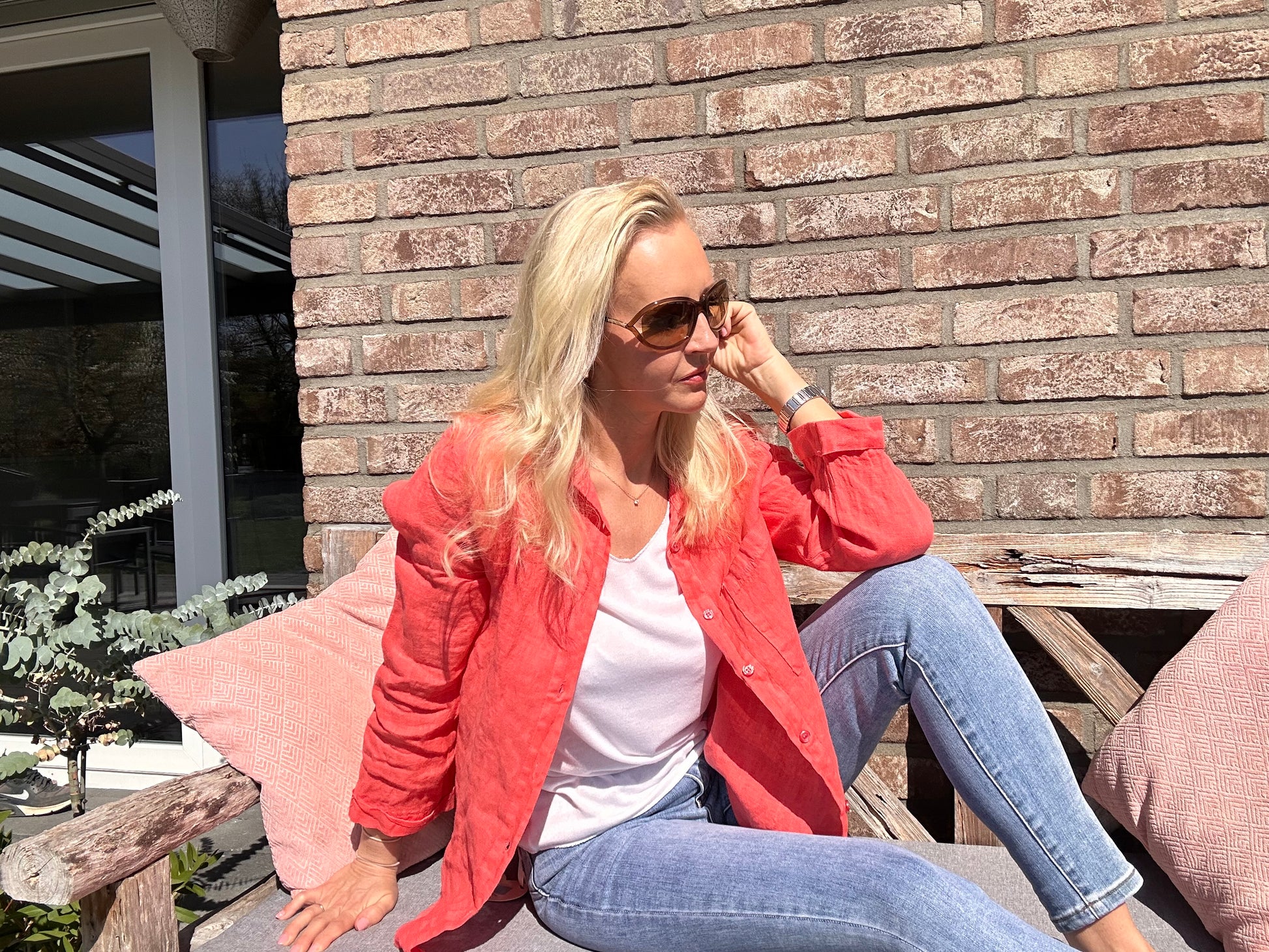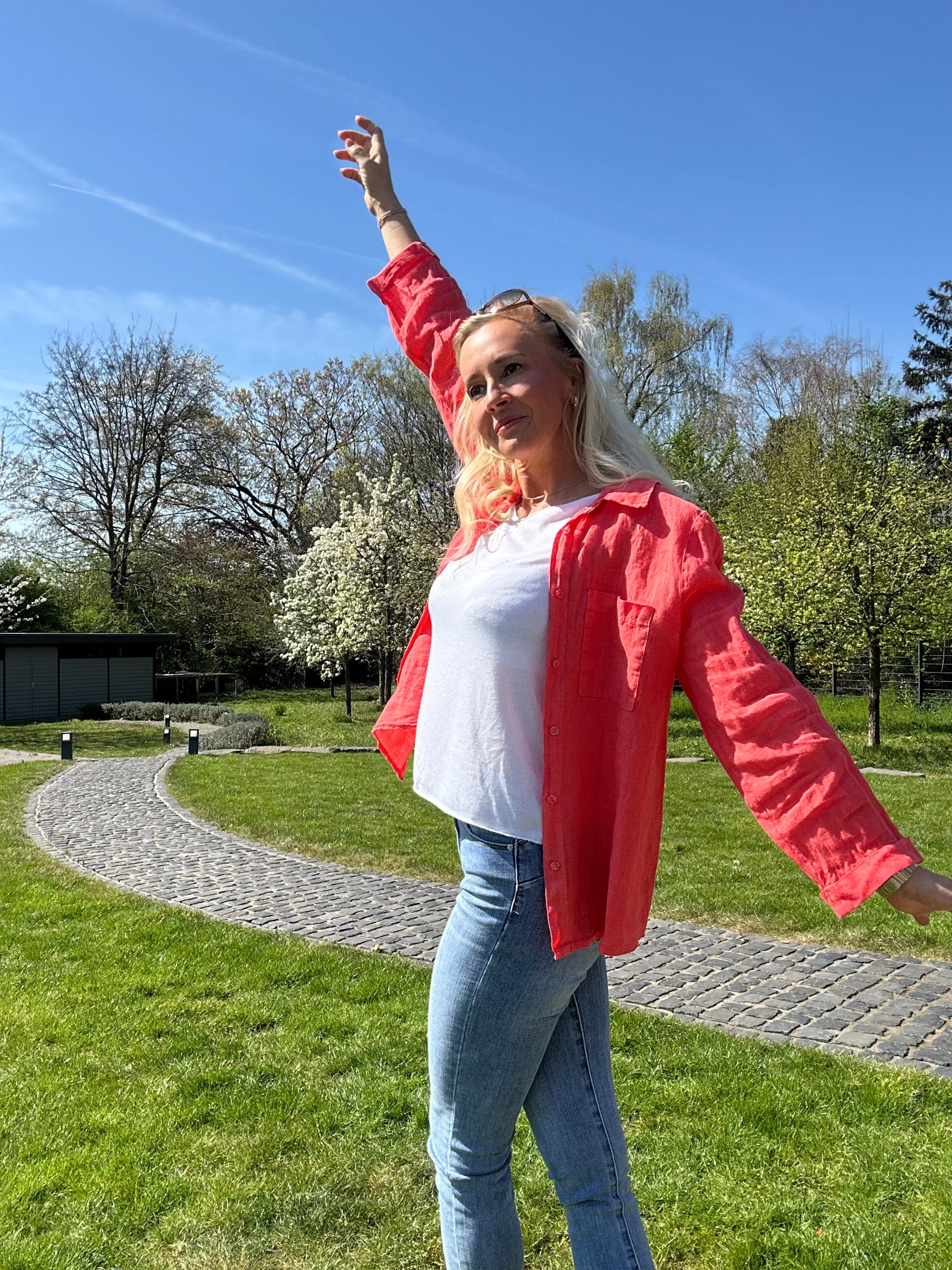Diese Bluse in Korallfarbe ist aus 100% Leinen gefertigt. Leinen ist ein atmungsaktives und strapazierfähiges Material, das sich perfekt für den Sommer eignet. Die Bluse ist zeitlos und vielseitig, perfekt für den Alltag oder auch für besondere Anlässe. Ein Must-Have für jede Garderobe.