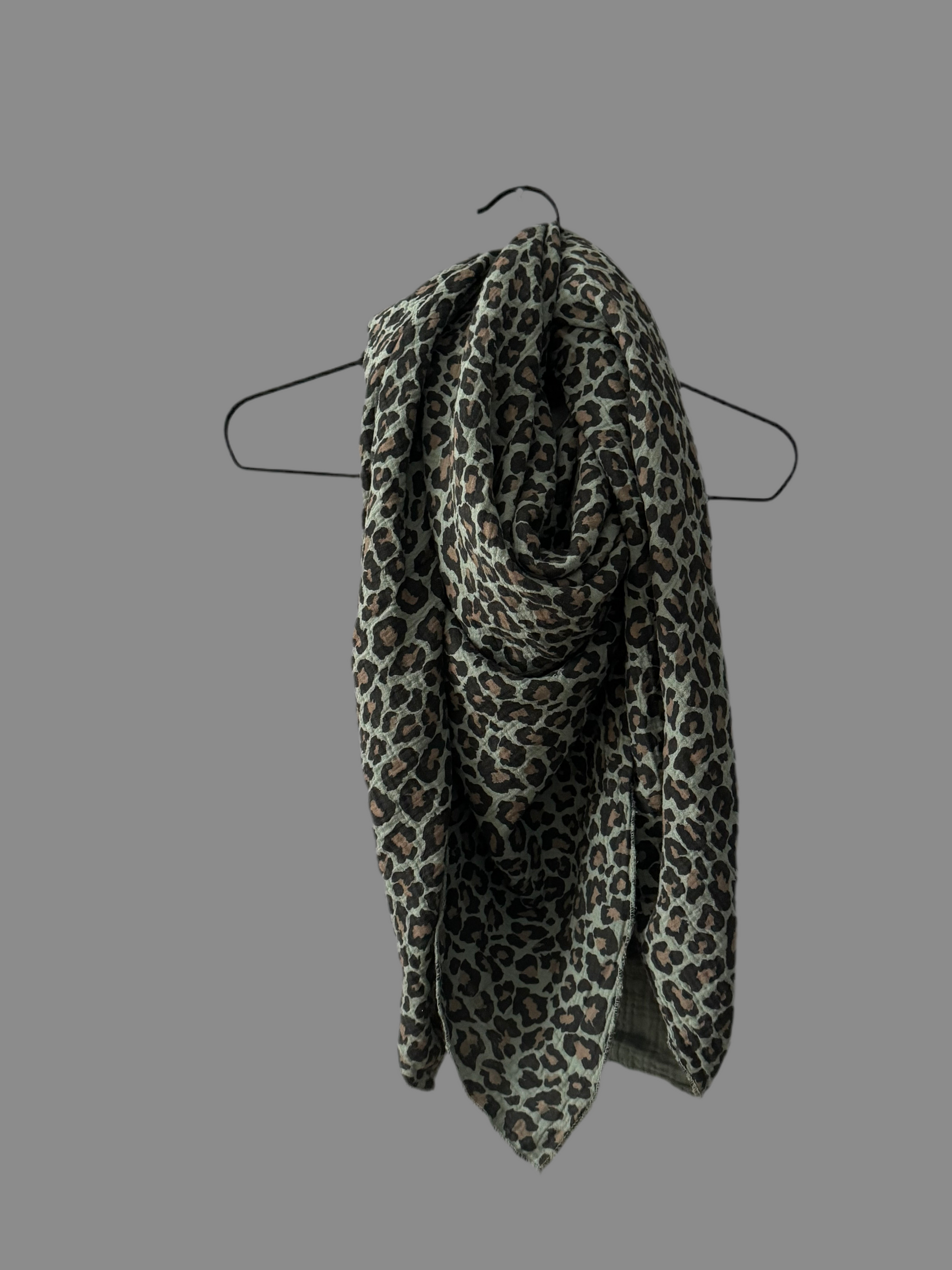 Mit seinen Maßen von 1,30 m x 1,30 m ist es perfekt geeignet und sich schön warm einzukuscheln. Wahlweise  in grün oder beige erhältlich. Ideal für alle, die Leo-Print und große Tücher lieben.