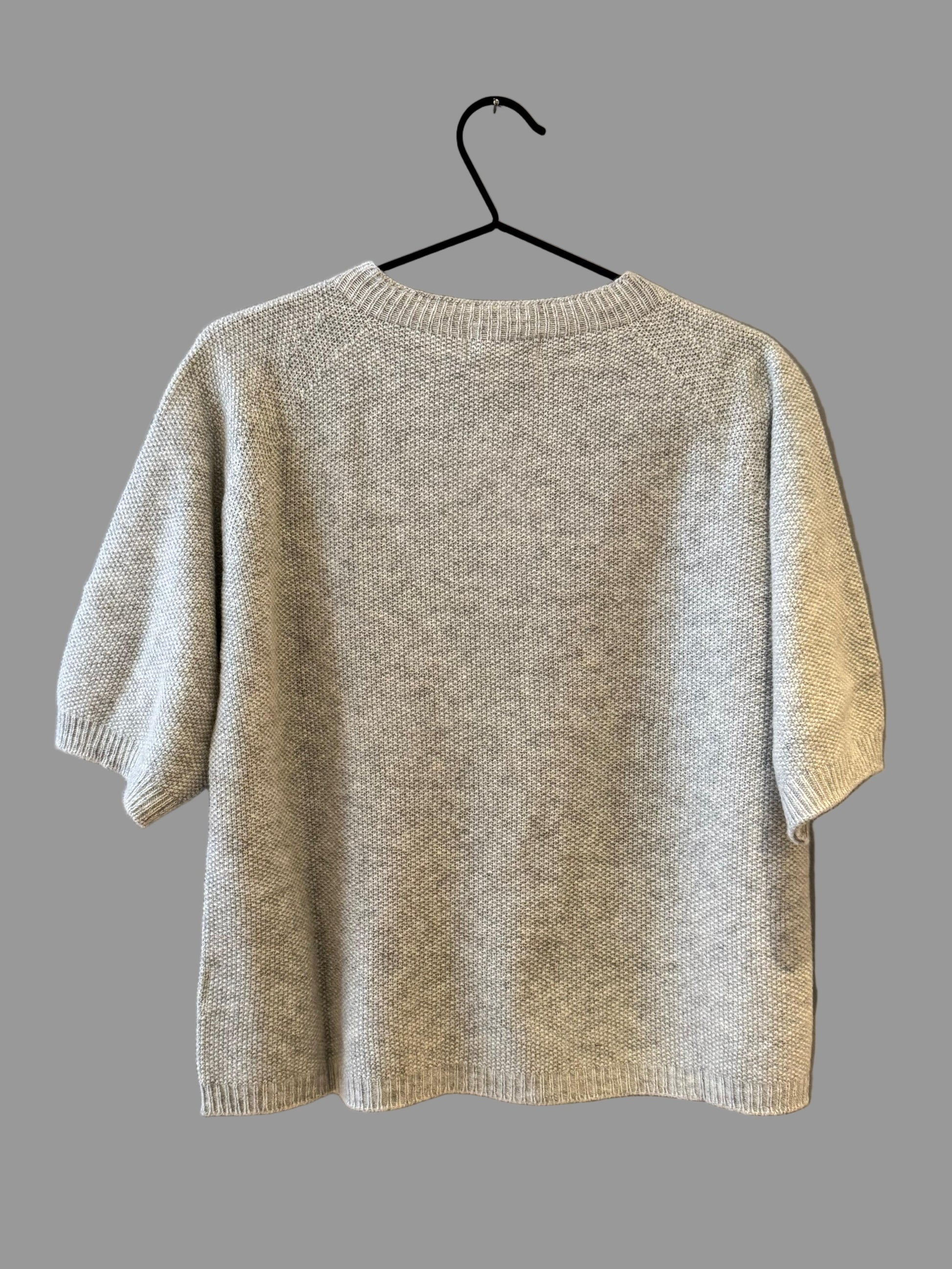 Zeitloser Strickpullover in sanftem Grau mit lockerer Passform und halblangem Ärmel. Die feine Strickstruktur sorgt für eine angenehme Haptik und einen lässig-eleganten Look – ideal für Übergangszeiten oder als leichter Pullover im Alltag.