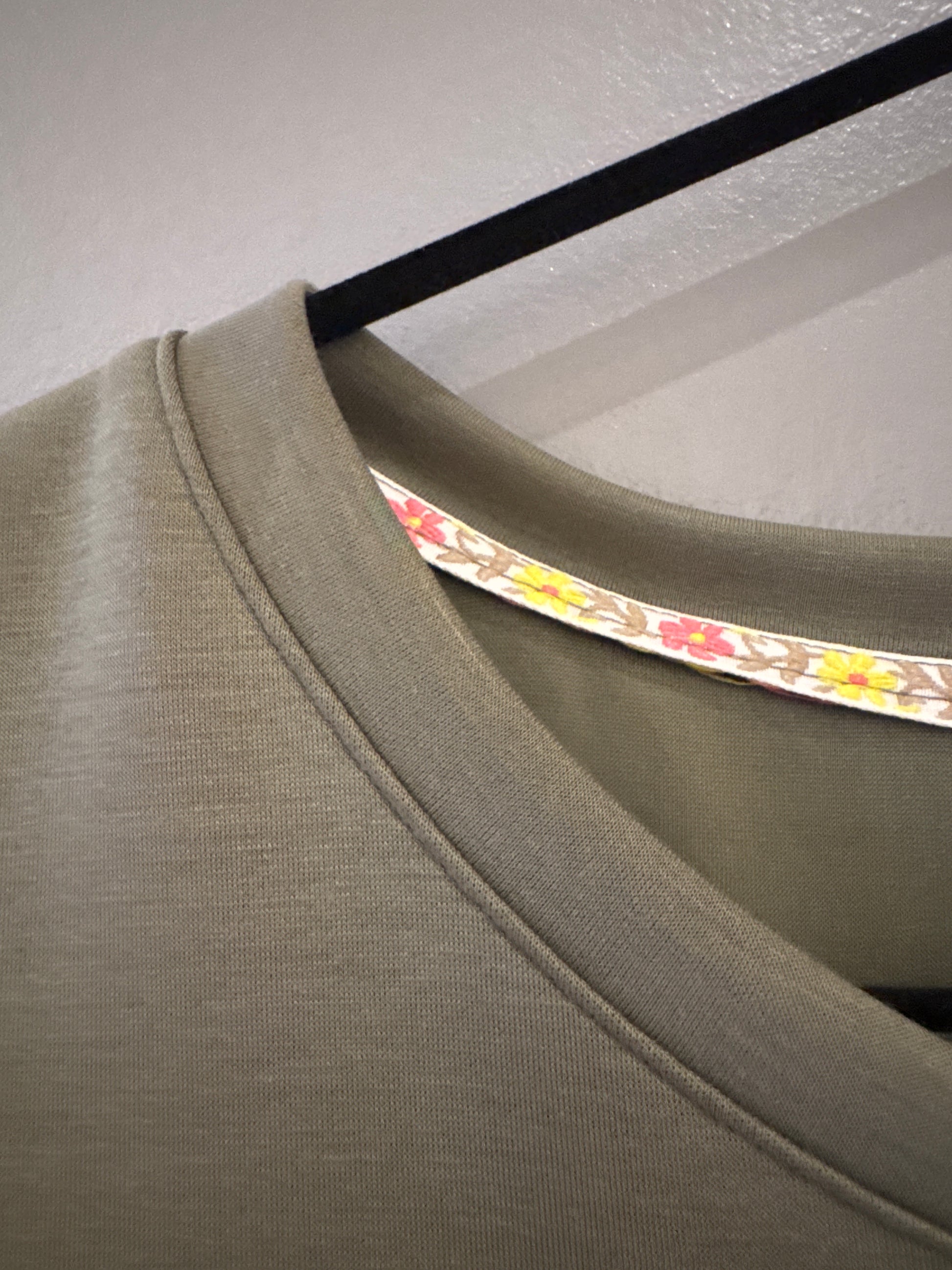 Dieses einfache Basic-Shirt in khaki ist aus einem dickeren, aber trotzdem weich fallendem Material gefertigt. Der abgenähte Kragen verleiht dem Shirt eine besondere Note. Mit auffallend guter Qualität ist dieses Shirt ein schöner und langlebiger Begleiter für jeden Tag.
