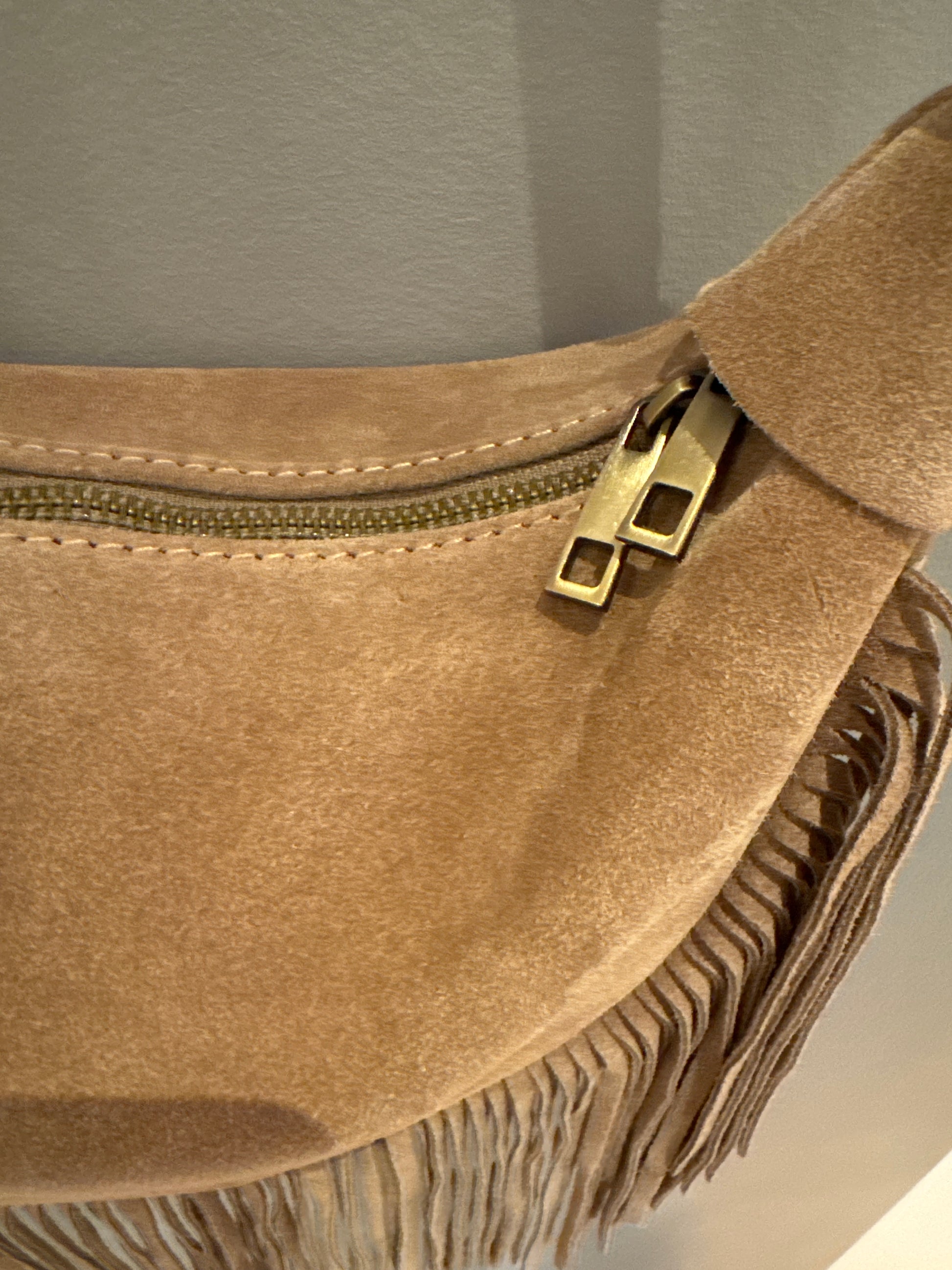 Stylische Umhängetasche aus Wildleder mit Fransen.