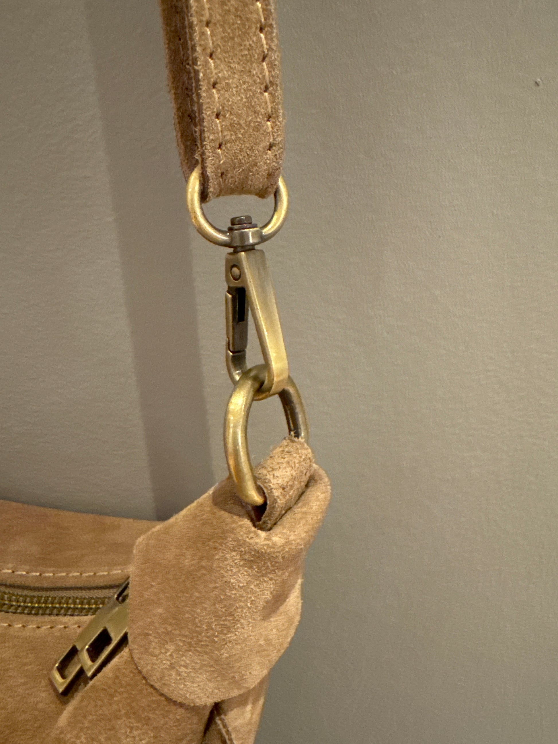Diese hochwertige Umhängetasche vereint lässigen Boho-Charme mit zeitloser Eleganz. Gefertigt aus weichem, beigefarbenem Wildleder, besticht sie durch ihre natürliche Struktur und den angenehm weichen Griff. Das besondere Highlight sind die langen, dekorativen Fransen auf der Vorderseite, die der Tasche Bewegung und einen trendigen Vintage-Look verleihen.