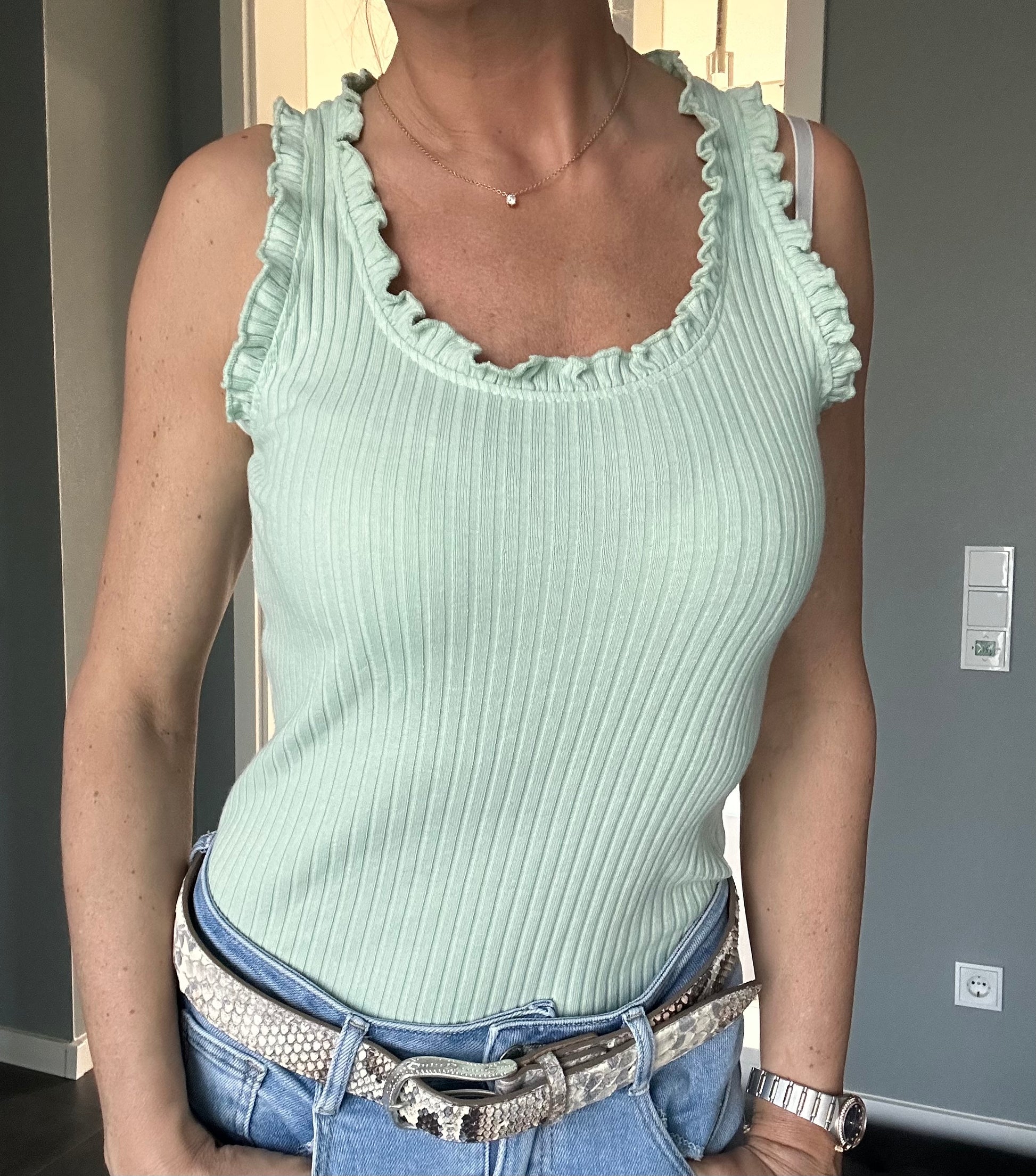 Ein Top mit einem femininen Rüschenrand - das perfekte Basic für deinen Kleiderschrank! Kombiniere es mit einer schicken Hose oder zur Jeans für einen lässigen Look. Leicht und angenehm zu tragen, für den Alltag oder besondere Anlässe. Hol dir jetzt dieses vielseitige Top.